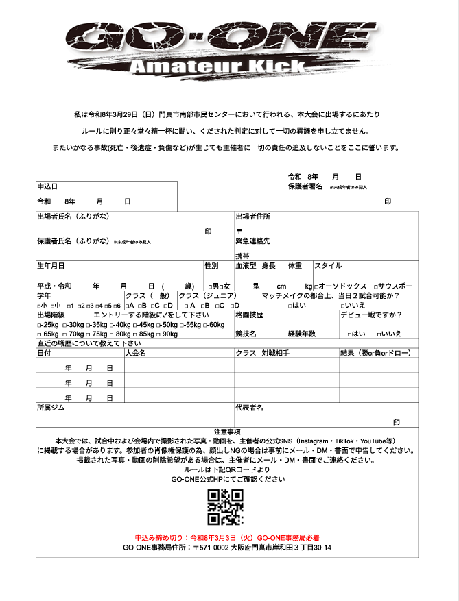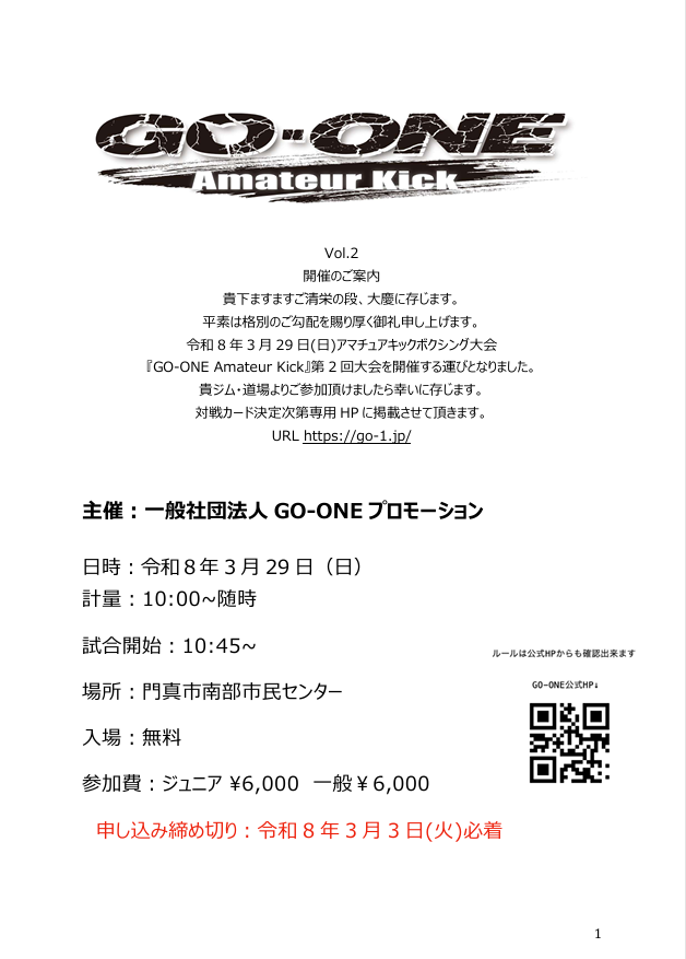 令和8年3月29日(日)アマチュアキックボクシング大会『GO-ONE Amateur Kick』第2回大会を開催する運びとなりました。貴ジム・道場よりご参加頂けましたら幸いに存じます。